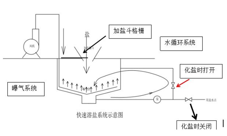通常化鹽系統(tǒng)是僅采用水泵循環(huán)方式溶鹽,這種溶鹽方式有以下缺陷: (1) 化鹽時(shí)間長(溶鹽時(shí)間要10小時(shí)以上) (2) 長時(shí)間運(yùn)行后池底有大量的污泥沉…
